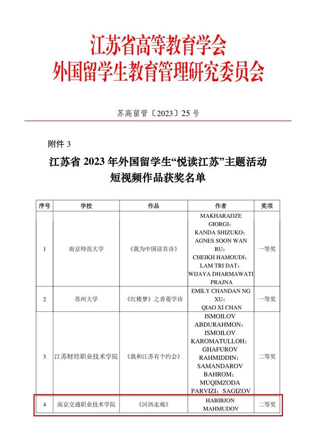 我院国际合作与交流办公室积极参与“悦读江苏”主题活动,组织教师向留学生推荐书单、参加活动,指导留学生结合亲身经历进行作品创作。《河西走廊》《归园田居》在“悦读江苏”作品大赛分获二等奖、三等奖。今后,学院将以“悦读江苏”活动为契机,着力打造“知行合一”的第二课堂,积极推广“行走+阅读”的学习新模式,帮助来华留学生更好地了解南京、了解江苏,品味这片土地悠久的历史文化底蕴,更好地传播中华文化。