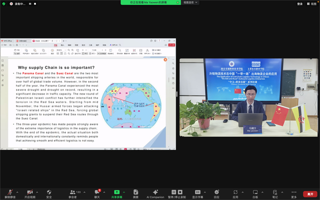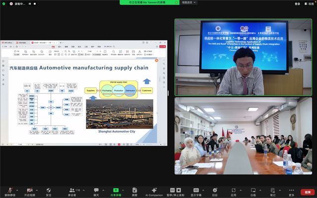 运输管理学院马耀文老师系统介绍了“一带一路”背景下供应链一体化创新、冷链物流技术在中国出海企业的应用以及产教融合对中国企业物流技术应用的推动。相关专业知识还有针对性地设计了线上技能训练和互动。培训内容专业性高、实用性强,学生们反响热烈。在互动答疑环节,马老师还就“推动新质生产力发展,与一带一路国家生产企业共同创新打造一体化供应链”与学生们开展了深刻的交流探讨,学生们踊跃提问,现场气氛活跃。