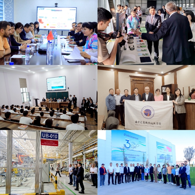 在乌兹别克斯坦期间,代表团重点考察了吉扎克国立技术学院郑和·宝船工坊项目建设情况,南京交通职业技术学院、南京工程学院、吉扎克国立技术学院、南京钜力集团校校企举行了郑和学院揭牌仪式,共同举办了合作研讨会,进一步总结项目经验,并谋划项目未来发展新的举措。王院长一行与现代物流管理、新能源汽车检测与维修2个专业的项目培养学历生进行了深入交流,并就来华学习、汉语言培训、毕业就业等内容进行了答疑,并深度调研了吉扎克国立技术学院校外实习工厂吉扎克比亚迪工厂厂区建设情况、面向乌市场主推车型、目前岗位需求等情况,就中文+技能培训进行了探讨交流。