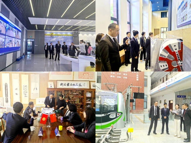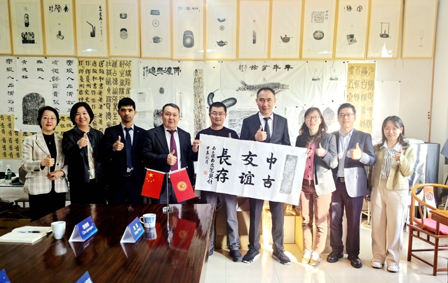 来访嘉宾们实地参观了学校路桥国家级虚拟仿真实训中心、轨道交通学院和人文艺术系的校内实训基地。阿兹莫夫·贝克图尔院长还亲自尝试了非遗拓印,中吉老师共同创作了一幅书画作品。奥什国立大学代表团对学院校园环境、实训室建设和文化传承技艺给予了高度评价,并对两校未来进一步深化合作表达了期待。