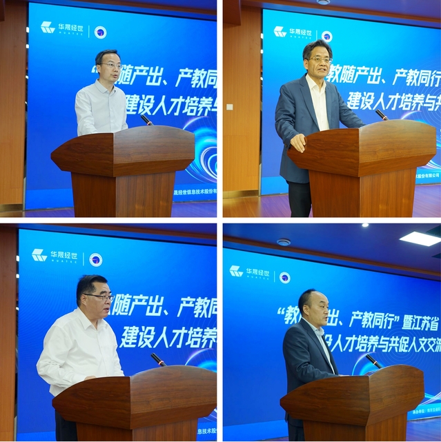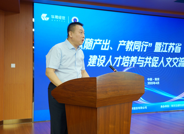 政府引导搭平台,政校企协同擘画产教融合蓝图。教育部中外人文交流中心副主任张学仁强调职业教育应立足国家战略需求,持续提升服务共建“一带一路”以及教育对外开放的能力。江苏省教育厅对外合作与交流处三级调研员郑兴则着重阐释了“教随产出”理念的实践路径,提出以产业需求为导向,优化教育资源配置,推动江苏高校与企业的进一步合作。江苏省教育国际交流协会副会长冯大生表示将搭建校企合作平台促进人才培养与产业需求精准对接,形成政策引领、平台支撑、多方协同的产教融合发展格局。学院党委书记张毅在欢迎辞中表示,作为“一带一路”交汇点的江苏高职院校将深化产教融合,突出交通特色,积极参与人文交流品牌塑造计划,高质量推动国际化人才培养。北京华晟经世信息技术股份有限公司董事长张勇则表示坚持“政府引导,企业赋能”的原则,助力高校培养应用型、复合型、创新型的国际化人才。