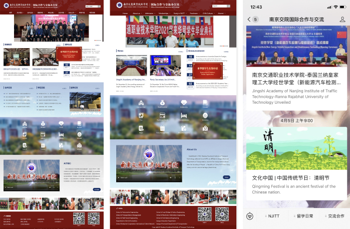 本次来华留学生招生网站专项评价分两个阶段进行,第一阶段,学院已根据文件要求,对留学生招生网站建设现状进行自我评估,找出存在的问题和不足,开展了来华留学生招生网站改版与更新,提交了《南京交通职业技术学院来华留学生招生网站建设自评报告》,建立了“南京交院国际合作与交流”官方微信号。目前,正在进行第二阶段,学院正在接收评审专家对我校来华留学生招生网站的检查评价。