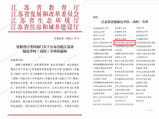 近日,省教育厅 、省发展改革委、省生态环境厅、省住房城乡建设厅公布全省首批绿色学校(高校)名单,学院被授予“江苏省绿色学校(高校)”称号。