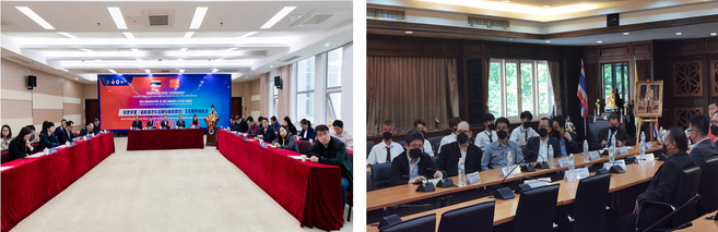 汽车工程学院教师代表刘奕贯用英文展示了学校新能源汽车检测与维修技术专业优势、师资水平、人才培养目标以及实训室建设情况。泰国兰纳理工大学新能源汽车创新班学生宋朋做了发言,他表示新能源汽车是全球汽车产业转型升级的主要方向,很荣幸参与中泰技术创新班学习,未来会将学习到的专业知识和技术技能,服务于泰国工业和新能源汽车产业。