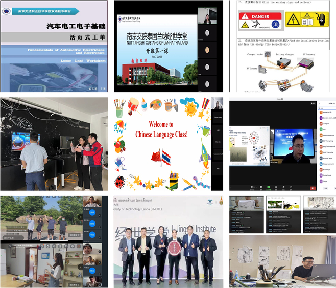 项目自启动以来,校-校-企三方克服疫情等诸多困难,破解“教师走不出去、学生进不来”困境,严格对照《鲁班工坊建设规程》,明确中泰新能源汽车检测与维修技术鲁班工坊的发展定位,在建设宗旨、办学基础、场地建设、师资队伍、教学资源、校企合作和办学成效等方面做了一系列的探索与实践,取得了阶段性的建设成果。先后完成了南京交通职业技术学院-兰纳皇家理工大学经世学堂基础环境建设、新能源汽车检测与维修专业海外实训室的建设;共同制定了“新能源汽车检测与维修技术(中泰合作)”人才培养方案,开发了《汽车电工电子基础》、《新能源汽车构造》等国际化课程和教学资源等;完成了海外创新班招生开班,采取“1+2+1”模式进行国际化人才培养;采取“云课堂+云参观+云交流”等多种方式,开展汉语课程教学和人文交流活动。立足汽车行业,挖掘“郑和精神”,语言教学中融入中华优秀传统、职业道德、工匠精神等元素;开展了中外学生“同读一本书”、非遗文化沉浸式体验、开学第一课校园参观等文化交流活动,实现了中泰师生间良好互动和文化互鉴。