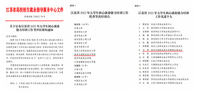 近日,江苏省高校招生就业指导服务中心发布《关于公布江苏省2022年大学生核心就业能力培训工作考评结果的通知》(苏教指通〔2022〕74号),学院获评“江苏省2022年大学生核心就业能力培训工作优秀等次培训点”,刘坤老师获得“江苏省2022年大学生核心就业能力培训工作先进个人”称号。