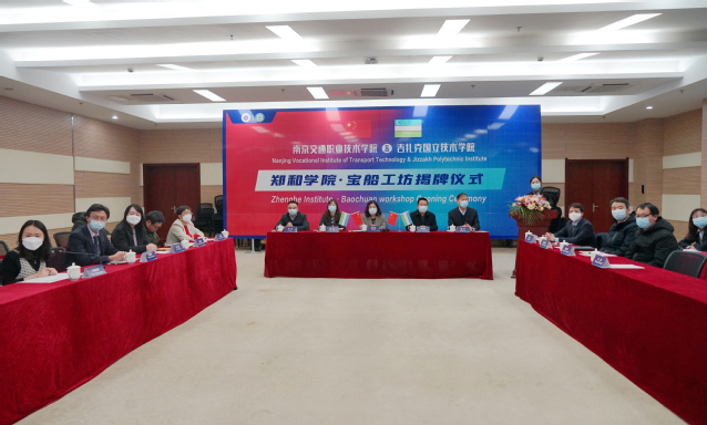 12月16日下午,南京交通职业技术学院—吉扎克国立技术学院郑和学院·宝船工坊揭牌及开班仪式在图书馆B203隆重举行。南京交通职业技术学院党委书记贾俐俐、党委副书记周传林;吉扎克国立技术学院校长乌斯曼库洛夫·阿利舍尔、副校长叶加姆纳扎洛夫·盖拉特、别尔季约罗夫·铁木尔、阿卜杜纳扎罗夫·贾姆希德出席仪式;国际合作与交流办公室、教务处、发展规划处、汽车工程学院、路桥与港航工程学院、运输管理学院等相关部门;吉扎克国立技术学院相关院系分别在南京、乌兹别克斯坦吉扎克以视频会议的形式参加了云揭幕仪式。