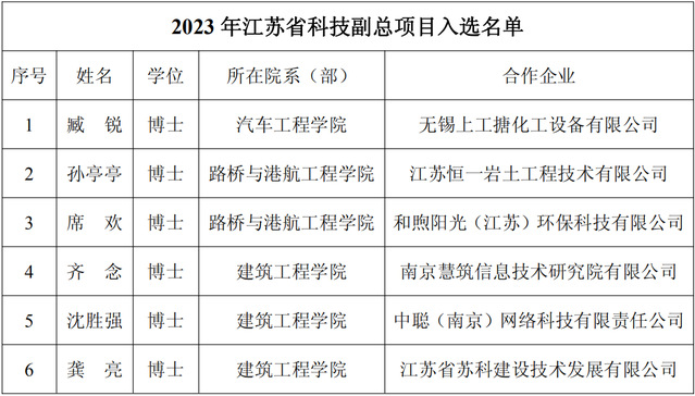 近日,江苏省委人才办、江苏省科技厅公布了2023年江苏省科技副总项目入选对象的名单(苏科区发〔2023〕139号),学院共有6名博士教师入选,入选人数名列全省高职院校前列。