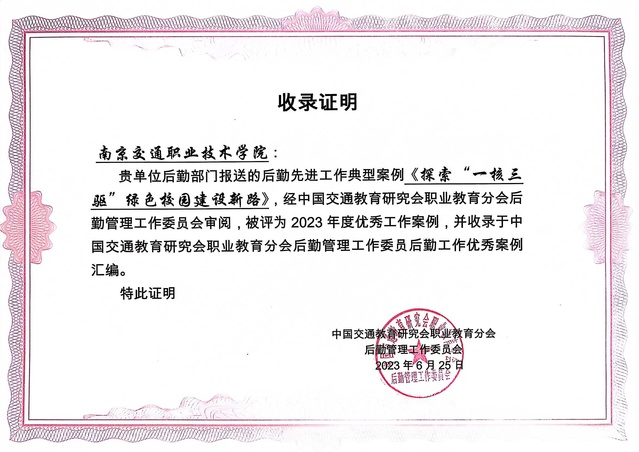 近日,中国交通教育研究会公布了2023年度后勤工作优秀案例评选结果。学院后勤管理部门提交的《探索“一核三驱”绿色校园建设新路》案例,从众多参评案例中脱颖而出,被评为本年度的优秀工作案例,并正式收录入中国交通教育研究会职业教育分会后勤管理工作委员会的后勤工作优秀案例汇编。