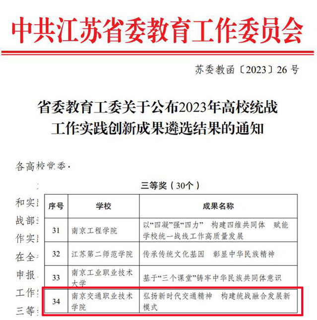 近日,省委教育工委公布了2023年高校统战工作实践创新成果遴选结果,学院报送的《弘扬新时代交通精神 构建统战融合发展新模式》荣获三等奖。