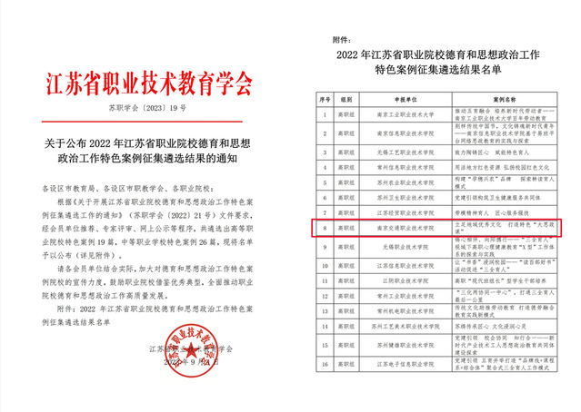 近日,江苏省职业技术教育学会公布了 2022 年江苏省职业院校德育和思想政治工作特色案例遴选结果,根据《关于开展江苏省职业院校德育和思想政治工作特色案例征集遴选工作的通知》(苏职学会〔2022〕21 号)文件要求,经会员单位推荐、专家评审、网上公示等程序,共遴选出高等职业院校特色案例 19 篇,马克思主义学院和党委宣传部联袂提交的以《立足地域优秀文化打造特色“大思政课”》为题的思想政治工作案例获选特色案例。