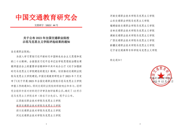 近日,2023 年全国交通职业院校示范马克思主义学院评选结果揭晓,南京交通职业技术学院马克思主义学院成功入选。