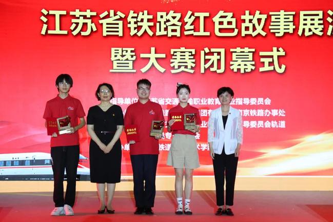 江苏省交通运输厅副厅长陈萍,江苏省铁路集团有限公司党委委员、机关党委书记王勤为学生组一等奖获奖学生颁奖。