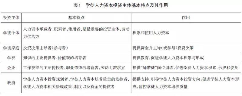 人力资本是凝结在人身上的知识、技能与健康等的总和,其所体现的是人的劳动能力。人力资本投资的根本目的是要实现高质量的就业和有效劳动力供给, 即通过市场配置,劳动力供给主体在获得物质和精神上的满足的同时,其所拥有的劳动素质和能力符合需求主体对劳动力的使用要求,并能有效转化为现实的生产力,实现劳动价值。人力资本投资能够加速人力资本积累,是一国经济持续增长的根源所在。人力资本积累既可以通过教育和培训形成,也可以通过在企业“干中学”得以实现。现实中,人力资本投资主体一般会涉及四类:学徒个体、家庭、学校以及政府。不过,中国特色学徒制背景下的学徒人力资本投资则不同,除上述四类投资主体之外,企业也是不可或缺的法定投资主体(表1)。