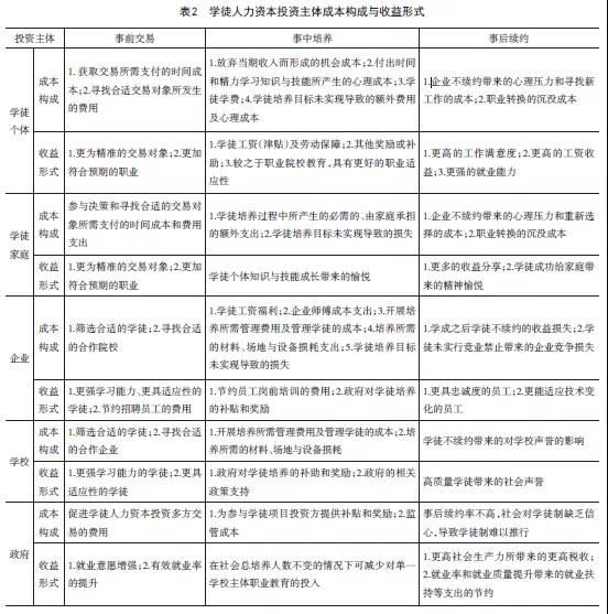 一般而言,学徒人力资本投资会涉及三个阶段,即投资之前的交易阶段、投资过程中的培养阶段以及培养结束后的续约使用阶段。对于投资主体而言,每一个阶段都可能产生一定的成本和收益,学徒人力资本投资成本构成与收益形式见表2。