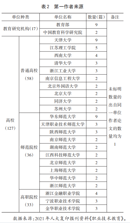人大复印报刊资料《职业技术教育》2021年所转载的144篇论文中,有两个或两个以上作者的文章有84篇,占论文总数的58.3%。大多数文章来自教育研究机构和各类高校(本文只统计了第一作者所在单位的情况)。来自教育研究机构的文章有17篇,占论文总数的11.8%,其中来自教育部的文章有9篇,占论文总数的6.3%。来自高校的文章共有127篇,占论文总数的88.2%;其中来自普通本科高校的有58篇,占论文总数的40.3%;来自师范院校的有36篇,占论文总数的25%;来自高职高专院校的有33,占论文总数的22.9%(表2)。