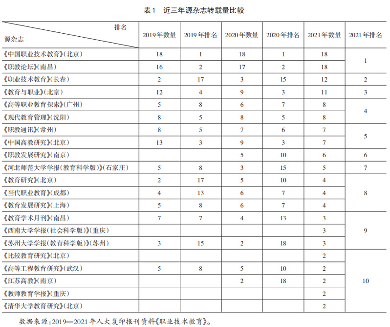 2021年人大复印报刊资料《职业技术教育》全文转载的144篇论文来源于全国33种学术期刊和《中国教育报》,源杂志数量比2020少了7种。以下选取学术水平较高、影响力较大的前十名进行排序(表1)。从近三年的源杂志转载量的比较来看,《职教发展研究》(南京)、《西南大学学报(社会科学版)》(重庆)、《比较教育研究》(北京)、《江苏高教》(南京)、《教师教育学报》(重庆)和《清华大学教育研究》(北京)这5种杂志的被转载量有明显增加,使其在2021年源杂志转载量排名中进入前列。
