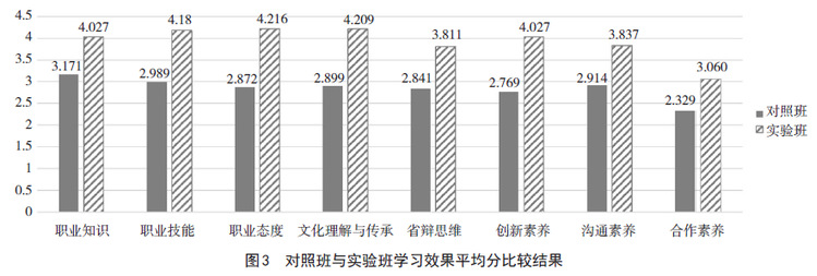 学生学习效果的对照班与实验班平均分比较结果,如图3所示。可以看出,线上线下混合式实训教学模式在八个维度上的学习效果都优于传统实训,并且在职业技能、职业态度、文化理解与传承以及创新素养四个方面的提升尤为明显。