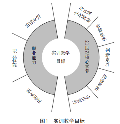 职业教育实训教学的根本目的是为了培养能够在真实的工作环境中胜任某一职业岗位的技能型人才,职业能力是实训教学培养的题中之义。一般认为,职业能力包含职业知识、职业技能和职业态度三个方面。实训教学不仅要关注实践技能的培养、理论知识的应用,还要重视职业价值观、职业认同感、人际交往能力等默会知识和情感态度的培养。另外,还需认识到职业能力内涵具有历史发展性及地域性,需要从更多元的维度构建职业能力观。因此,为了使实训教学目标兼具时代性与泛用性,本研究引入了“21世纪核心素养5C模型”。该模型是由北京师范大学的研究团队在美国21世纪学习联盟提出的“4C”模型的基础上进一步扩展得到的,包含文化理解与传承(Cultural Competence)、省辩思维(Critical Thinking)、创新素养(Creativity)、沟通素养(Communication)与合作素养(Collaboration)五个方面。职业能力与21世纪核心素养共同构成了实训教学目标,如图1所示。