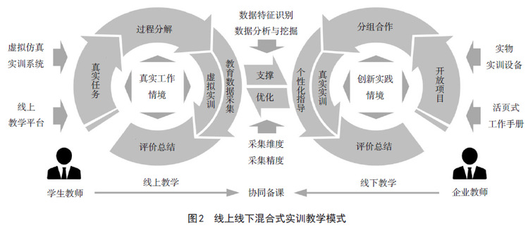 线上线下混合式实训教学中,线上和线下是两个需要有密切联系的部分。因此,在线上线下混合式实训教学中,主要通过以下两个方面实现深度联通。一是线上线下教师协同备课。学校教师和企业教师共同进行学情分析、教学内容和目标分析,并完成信息化教学资源的设计与开发等工作,共同完成教学设计。同时,学校教师要确保教学设计契合实训教学目标;企业教师则要确保线上教学工作情境与工作任务的真实性以及线下教学开放项目的可行性、创新性和实践性。二是线上线下教育数据共享。虚拟实训系统采集的学生在虚拟实训中的过程性操作数据,通过数据特征识别、数据分析与挖掘等技术分析学生的学习情况,再交由线下企业教师进行人工分析,发现学生典型性工作技能掌握的不足之处,并在线下教学中予以个性化指导;在线下教学过程中,企业教师应注意发现学生的共性问题,为线上教学提供优化建议,同时,调整教育数据的采集维度与精度,为线下教学提供更多有效信息。