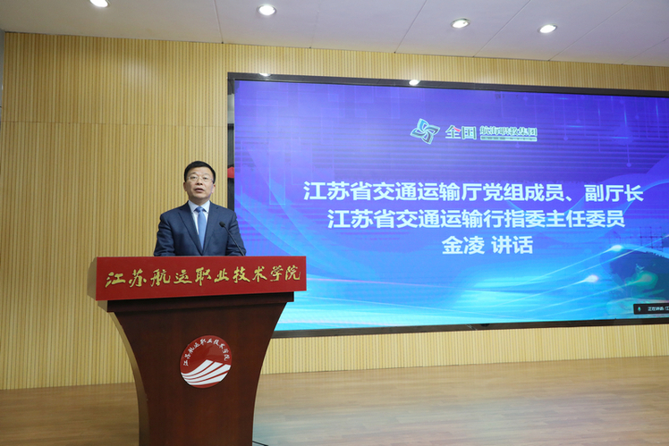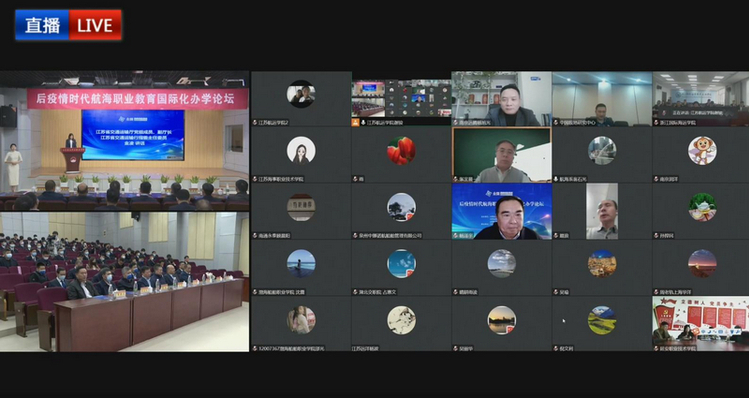 11月25日下午,由中国交通教育研究会职业教育分会航海专委会、江苏省交通运输行指委航海类专委会、全国航海职教集团(简称“两委一集团”)主办,江苏航运职业技术学院承办的后疫情时代航海职业教育国际化办学论坛采用线上线下相结合的方式举行。江苏省交通运输厅副厅长、江苏省交通运输行指委主任委员金凌,江苏海事局副局长王秀峰,南通海事局副局长薛建军,南通海事局船员管理处处长黄桂兵,南通通洋船舶管理有限公司副总经理王保成,交通行指委航海类专委会主任委员、全国航海职教集团理事长、江苏航运职业技术学院院长施祝斌在主会场出席,来自全国各地航海职业院校、相关企事业单位及部分国外航运企业的领导、专家和代表等200余人齐聚“云端”,相关师生代表出席线下主会场的开幕式和论坛。活动由全国航海职教集团副理事长兼秘书长、江苏航运职业技术学院副校长吴丽华主持。