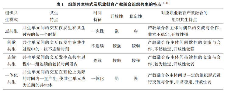 根据组织共生模式的分类,职业教育产教融合共生单元的共生关系同样可能存在点共生、间歇共生、连续共生和一体化共生等不同的类型,并具有各自不同的共生特点(表1)。