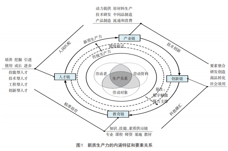 新质生产力由技术革命性突破、生产要素创新性配置、产业深度转型升级而催生,以劳动者、劳动资料、劳动对象及其优化组合而成的生产关系为基本内涵,以全要素生产率大幅提升为核心标志,代表着新形态、高水平且可持续的现代化生产力,是中国式现代化建设新型生产关系的生动诠释。其中“新”反映技术的颠覆性和革命性,强调以创新主导变革传统经济增长方式、生产力发展路径,衍生新场景、新业态、新模式,塑造新动能,构建全新生产关系。“质”则突出符合新发展理念的生产力要素系统相互适应、彼此协调的生产关系质态,是以算力为核心驱动力、以数据为关键生产要素、以智能化为显著特征的新型生产力形态。新质生产力发展需要以产业链、人才链、教育链、创新链融合生成生产函数,以关键性颠覆性技术为突破口,实现生产方式和经济增长的质态跃升(图1)。