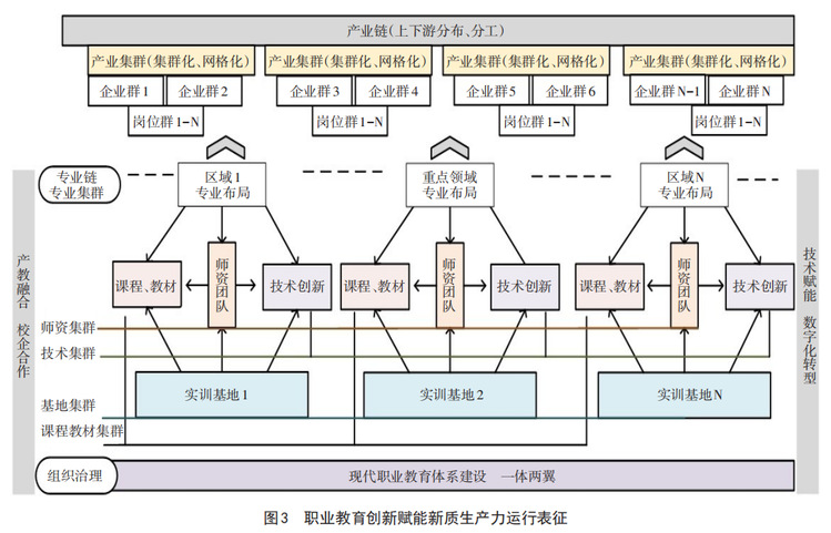 区域职业教育体系建设应与新质生产力质态发展相统一,专业建设与区域产业布局、特色发展优势相一致,教育链与产业链、人才链、创新链有机衔接。政府统筹作用发挥充分,针对省域、重点行业、核心地区,建设市域联合体、行业产教融合共同体,明确产业边界,按照“产业链条—产业集群—重点企业”科学规划产教融合布局,专业链、专业集群与产业链、产业集群匹配对接,推动区域性产业发展空间集成化布局、功能性重点领域集成化设置、专业建设与产业发展紧密对接的新格局。