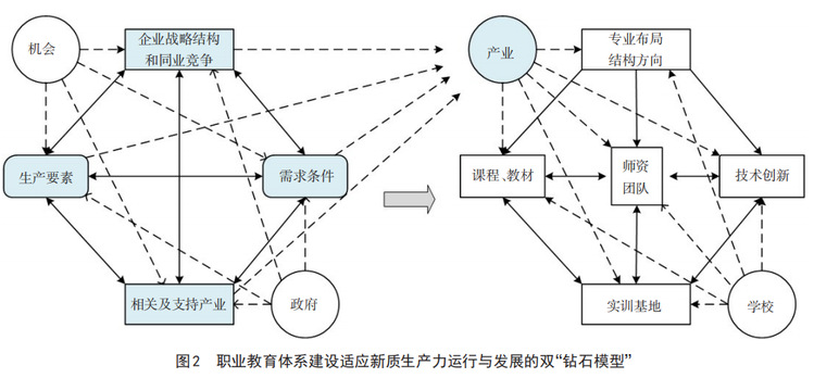 现代职业教育的使命责任是培养更多适应产业迭代升级的高素质技能人才。现代职业教育体系建设要适应生产力新质态变化,紧密对接产业布局结构调整变化、生产一线岗位需求,促进学校关键办学能力整体提升。其基本结构和运行组成对应支撑新质生产力运行的钻石模型各要素,构建形成职业教育体系建设改革系统。