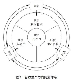总之,与传统生产力不同,“新质生产力代表着一种生产力的跃迁,是生产和社会生活中出现的一种以新兴科技创新为主导、以新型生产要素为驱动、以战略性新兴产业和未来产业为载体,以人与自然和谐共生为目标的全新的、具有颠覆性的、能够显著提高生产效率和人类生活质量的力量,不仅仅是对传统生产力的单纯升级,还是一种新的生产方式、生产组织形式与经济发展模式”。新质生产力的主要组成要素包括新质劳动者、新质生产资料(劳动工具、劳动对象)和新质科学技术,是一个通过产业转型和教育投入,推动政、产、学、研协同创新,进而实现创新、产业和教育三位一体、融合共生的内涵体系(图1)。
