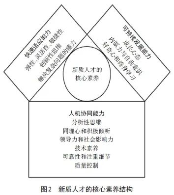 首先,数字技术的快速更新必然引起工作环境快速多变,新质人才需要尽快适应工作环境,应对产业高端化、智能化、绿色化、融合化所带来的挑战。因此需要具备弹性、灵活性、敏捷性,创新性思维和解决生产中的复杂问题的能力。其次,在人机结对协同工作成为常态的情况下,分析性思维、同理心和积极倾听、领导力和社会影响力、技术素养、可靠性和注重细节、质量控制等,是人类发挥思维和感知力优势,实现与人工智能(AI)机器设备协作共创的必备素养。再次,“成长心态(Growth Mindset)是人们通过不懈的学习努力追求卓越的心源动力,学习的目的就是要构建面向未来的学习力,以帮助其在理解当下的有限客体的过程中,形成对未来无限客体的持续适应”、成长心态、内驱力与自我意识、好奇心和终身学习构成新质人才保持核心竞争力的“安全基底”。