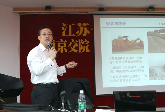 在近两个小时的报告中,施伟斌先生详细阐述了我国公路行业发展现状及养护市场的广阔前景,国内外养护技术简介及发展趋势预测,介绍了目前世界上最先进的公路养护技术——英达就地热再生技术和公路养护市场迅猛发展带来的人才紧缺问题及解决办法。报告内容丰富、深入浅出,无论是科研思路、企业管理方法,还是具体的人生仕途规划等问题,均给人以启发和思考。报告会上,与会师生还就自己感兴趣的问题与施伟斌先生进行了深入交流和探讨。
