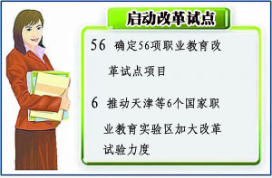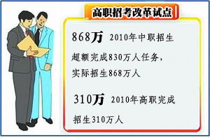 教育规划纲要颁布实施一年来,职业教育改革发展进入历史新阶段。中职教育2010年超额完成830万人的年度招生任务,实际招生868万人。逐步深化以单独招生为主的高等职业教育招生考试改革,2010年高职学校完成招生310万人,其中,高职学校对口招收中职学校毕业生已达45万人,占当年高职学校招生总数的14%。单独招生工作已覆盖73所高职学校,年招生25505人。教育改革试点工作启动,确定了56项职业教育改革试点项目和6项继续教育改革试点项目,重点推进职业教育办学模式改革,推动天津等6个国家职业教育试验区加大改革试验力度。(信息来源:中国教育报)