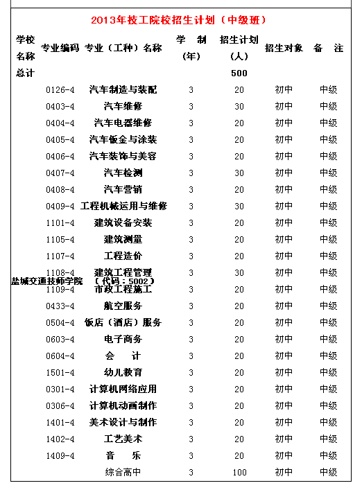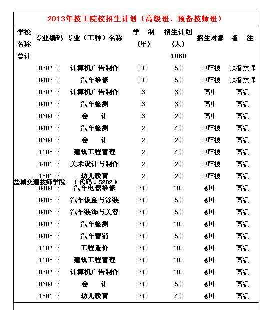 盐城交通技师学院2013年招生计划表