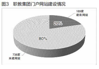 截至2013年底,在全部927个职教集团中,建有门户网站的职教集团仅189个,占职教集团总数的20.39%(见图3)。其中中职院校牵头的职教集团为49个,占建有网站的职教集团总数的25.93%,高职院校牵头的职教集团为129个,占建有网站的职教集团总数的68.25%,其他(企业、行业协会、培训机构、政府部门)牵头的职教集团为11个,占建有网站的职教集团总数的5.82%。高职院校牵头的职教集团门户网站建设水平高于其他职教集团,但总体上看门户网站的建设进度与当前信息技术手段的广泛应用有较大差距,急需加快改进。