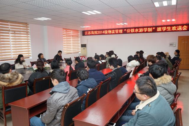 1月6日上午,南京交通职业技术学院在齐贤楼418会议室为江苏海事职业技术学院2014级物流管理专业“公铁水游学制”游学班的45名学生举行简短而热烈的欢送会。学院全体负责人及班主任老师参加了欢送会。