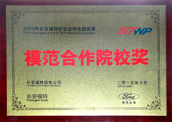在“长安福特校企合作全国竞赛”中,学院荣获2015年长安福特校企合作项目“模范合作院校”称号,汽车工程学院文爱民获“模范项目负责人”称号,程丽群获“模范教师”称号,乔宗权获“优秀教师”称号,李飞飞等8名学生获“优秀学生”称号。