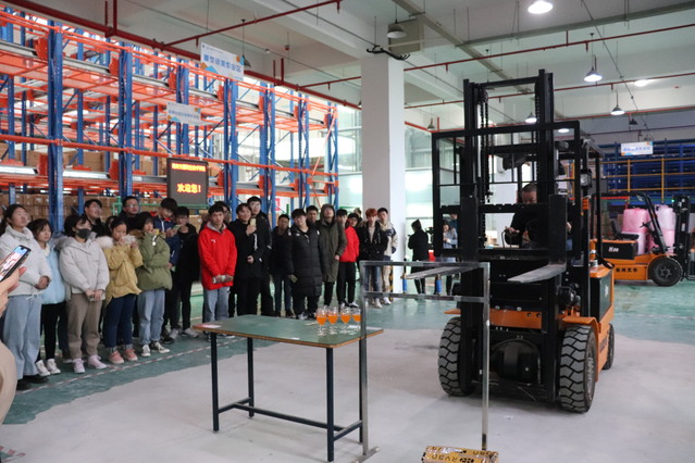 揭牌仪式结束后,邵世传师傅来到实训基地给同学们带来他的叉车“小游戏”演练,受到师生一致好评。
