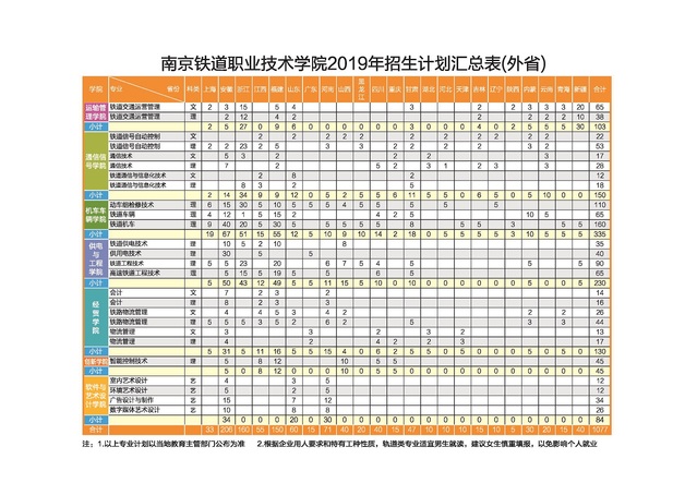 南京铁道职业技术学院2019年跨省招生计划一览表