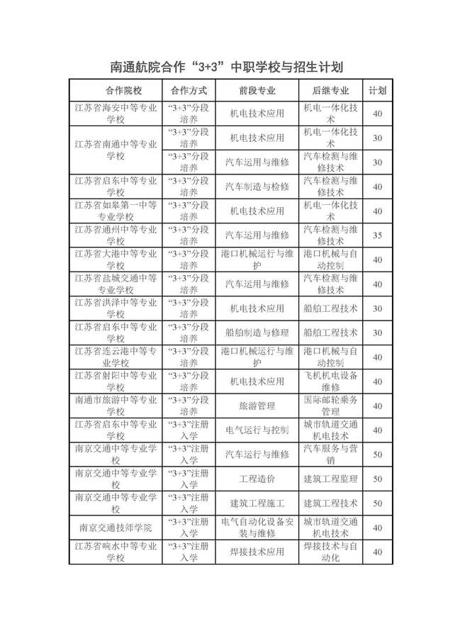 南通航运职业技术学院合作“3+3”中职学校与招生计划