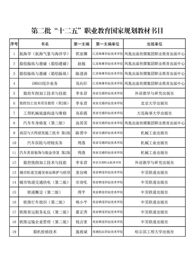 根据《教育部关于“十二五”职业教育教材建设的若干意见》(教职成〔2012〕9号),经组织出版单位申报、专家评审立项、出版单位编写(修订)和全国职业教育教材审定委员会审定等过程,共80家出版单位的2611种教材入选第二批“十二五”职业教育国家规划教材(以下简称“十二五”规划教材)。现将此批教材书目予以公布,并就有关事项通知如下: