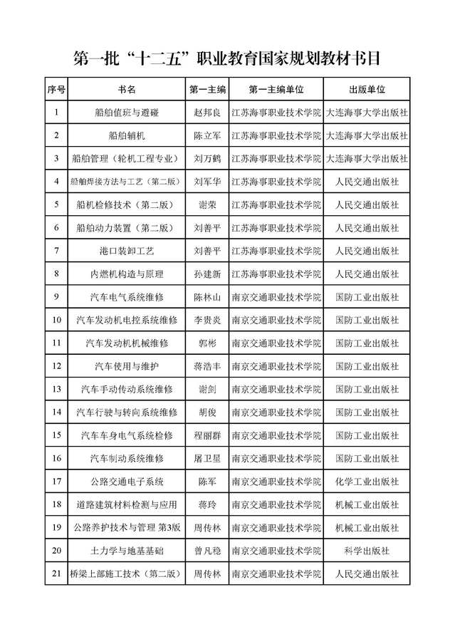 根据《教育部关于“十二五”职业教育教材建设的若干意见》(教职成〔2012〕9号),经组织出版单位申报、专家评审立项、出版单位编写(修订)和全国职业教育教材审定委员会审定等过程,共81家出版单位的4738种教材入选第一批“十二五”职业教育国家规划教材(以下简称“十二五”规划教材)。现将此批教材书目予以公布,并就有关事项通知如下: