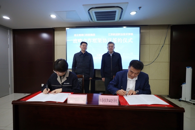 10月22日,学校与连云港港口控股集团第三轮校企战略合作签约仪式在连云港港举行。签约仪式上,学校党委书记薛扬和集团总裁朱向阳分别发表讲话,学校副校长李军和集团工会主席陈光平签订了校企战略合作协议,双方将在培养基地建设、职工培训、人才培养及产教融合等方面开展全方位合作,实现互利共赢。