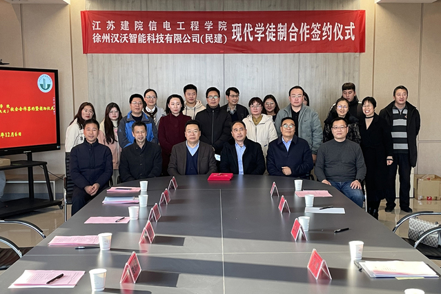 12月6日下午,我校与徐州汉沃智能科技有限公司在图书馆四楼会议室举行现代学徒制合作协议签约仪式。副院长刘海波,民建徐州市委专职副主委王奉君,徐州汉沃总经理张龙、副总经理郑莉,学校统战部、校企合作处、信电工程学院、民建江苏建院支部等负责同志等出席签约仪式。