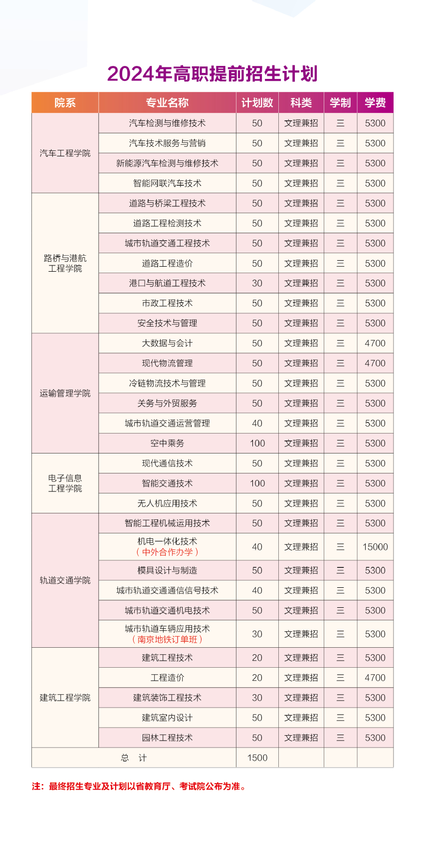 南京交通职业技术学院2024年高职提前招生计划