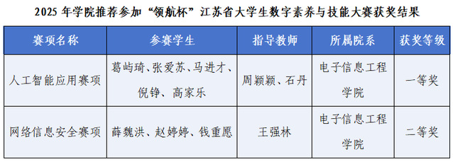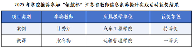 近日,2025年“领航杯”江苏省教育信息化应用能力大赛结果正式公布,我院师生在教师信息素养与学生数字素养两大竞技舞台上表现卓越,荣获特等奖1项、一等奖2项、二等奖1项。