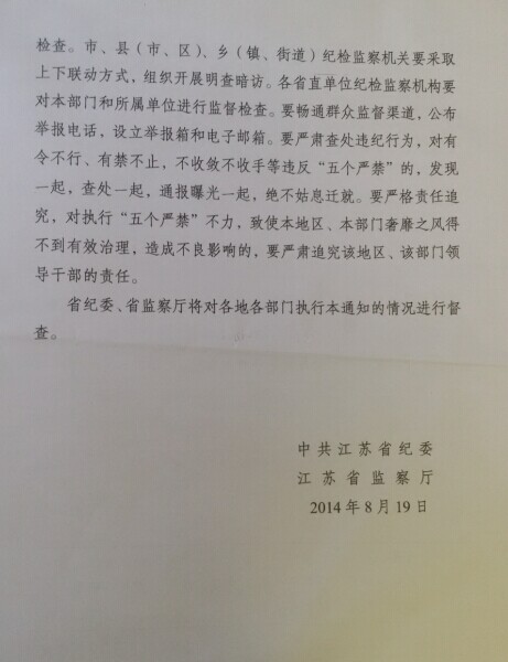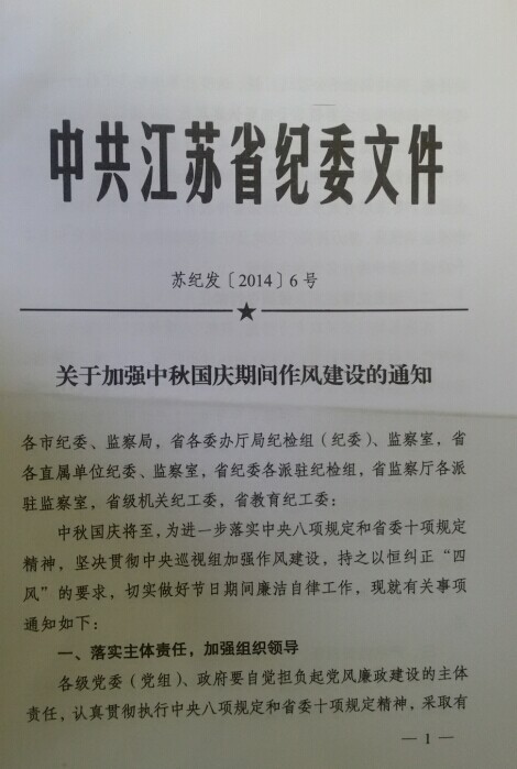 江苏省纪委《关于加强中秋国庆期间作风建设的通知》