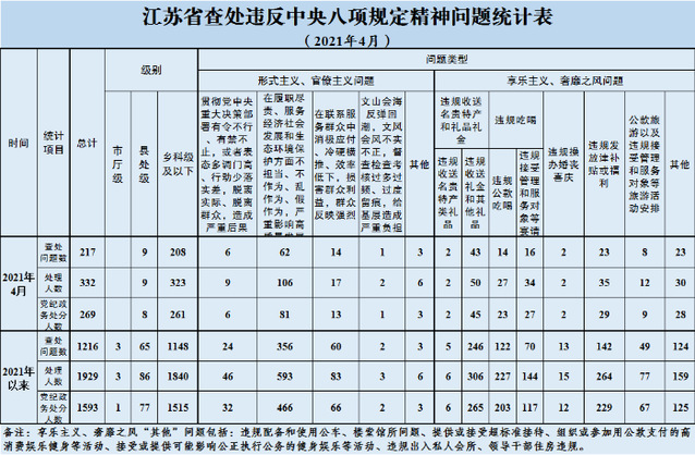 2021年4月,全省共查处违反中央八项规定精神问题217起,处理332人,其中给予党纪政务处分269人。从问题类型看,查处形式主义、官僚主义问题86起、处理140人,查处享乐主义、奢靡之风问题131起、处理192人。从人员级别看,处理县处级干部9人、乡科级及以下人员323人。