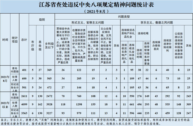 2021年8月,全省共查处违反中央八项规定精神问题401起,处理600人,其中给予党纪政务处分501人。从问题类型看,查处形式主义、官僚主义问题168起、处理265人,查处享乐主义、奢靡之风问题233起、处理335人。从人员级别看,处理市厅级干部5人、县处级干部30人、乡科级及以下人员565人,其中,因作风不严不实、履行疫情防控管理监督职责不到位问责处理市厅级干部5人、县处级干部9人、乡科级及以下人员90人。