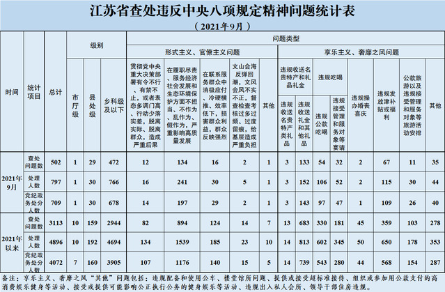 2021年9月,全省共查处违反中央八项规定精神问题502起,处理797人,其中给予党纪政务处分709人。从问题类型看,查处形式主义、官僚主义问题165起、处理293人,查处享乐主义、奢靡之风问题337起、处理504人。从人员级别看,处理市厅级干部1人、县处级干部30人、乡科级及以下人员766人。